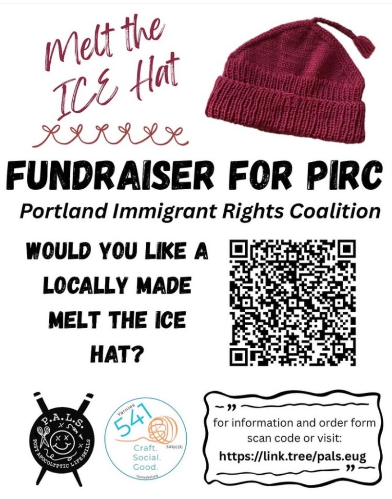 Post Apocalyptic Life Skills (P.A.L.S.) is the craftivism “thread” of Yarnies 541– it began after members of Yarnies organized a successful “ICE OUT” Protest, and we saw that crafters wanted more ways to be active in our community both politically and creatively. Our goal with P.A.L.S. is to create opportunities for people to be involved in craftivism, through organizing events, fundraisers, and collective projects that engage with movements that are close to us. If you are looking for collective action and communal projects, you are in the right place. With P.A.L.S., we hope to create a lasting impact beyond the fiber community. Together we can imagine and create a better future, one stitch at a time.