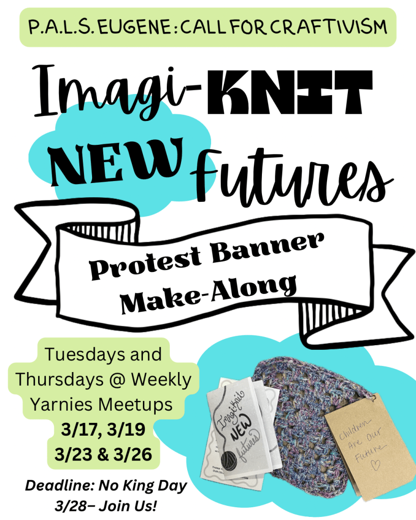 It’s easy to get caught up in the things we don’t like about our current world, and sometimes we forget to dream of a better future. Our “Imagi-Knit New Futures” kits will guide you through the process of imagining a positive and hopeful future that you can then infuse into your yarn. Crafters are welcome to knit or crochet their own yarn or hand them off to a PAL to be made into 6 inch squares. Squares will be incorporated with messages of a hopeful future into a banner that we will display at the March 28th 2026 “No Kings” protest.